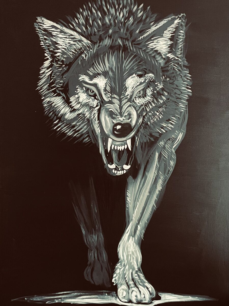 "Dont forget to feed your wolves or they might take you for food!" Canvas artwork made with Acrylics. My largest wolf painting to date. Made this as a commission for my brother Jake and it now hangs in his dinning room. 11x14 prints are AVAILABLE.