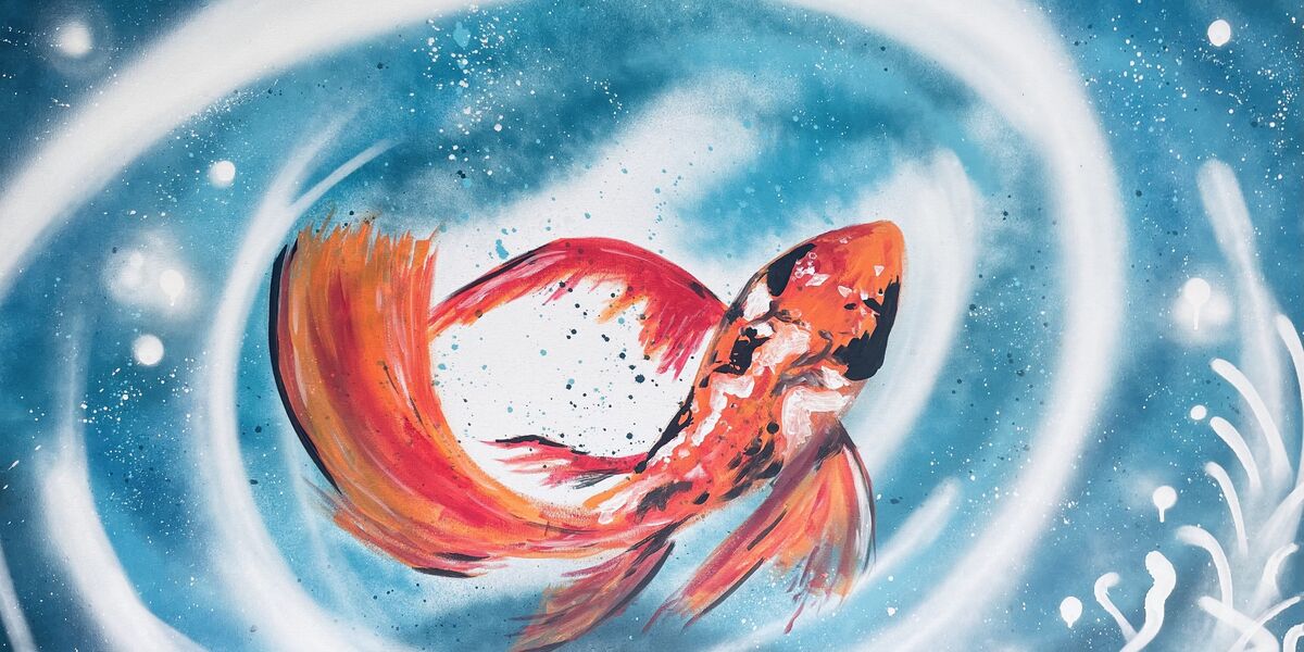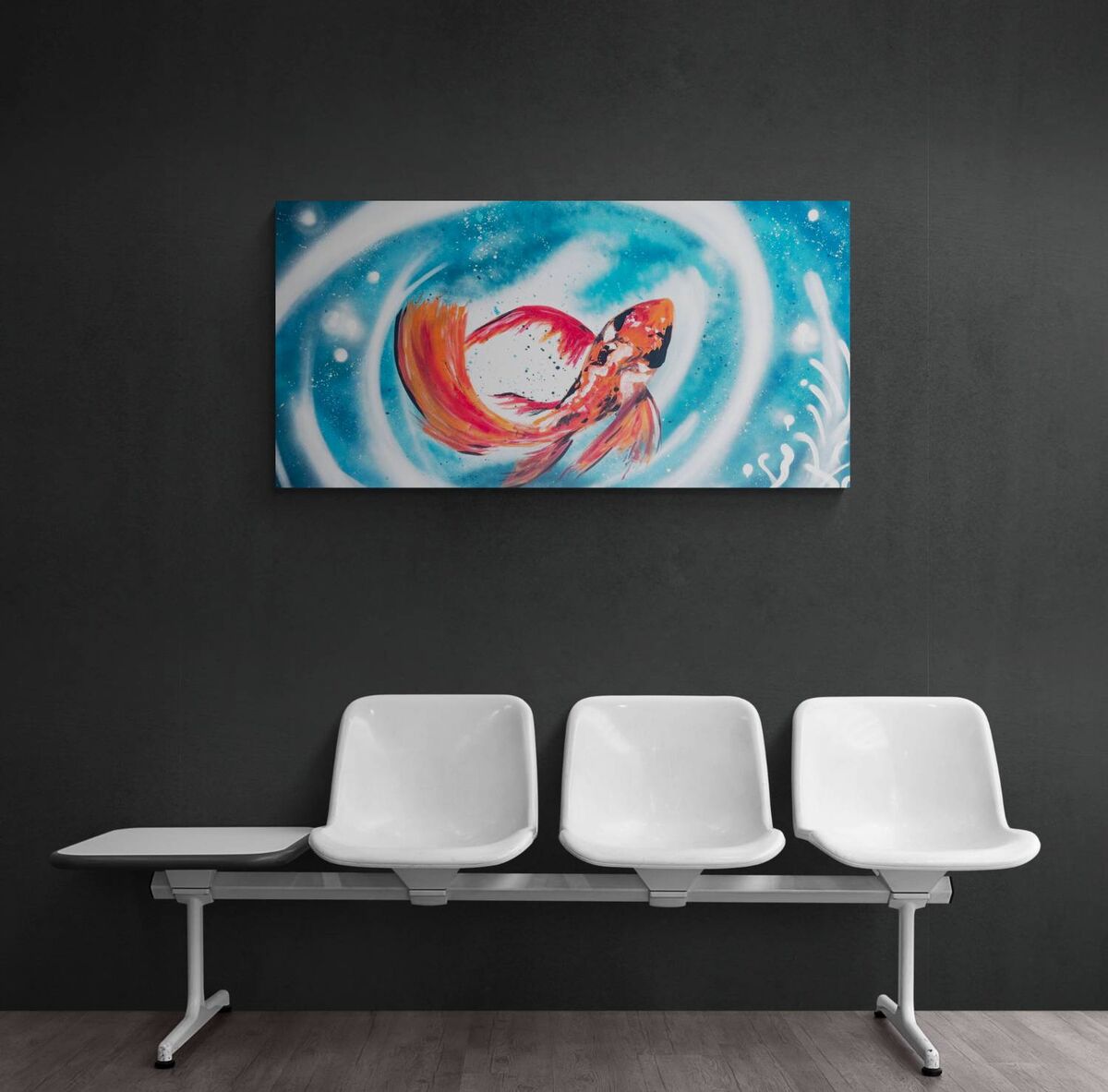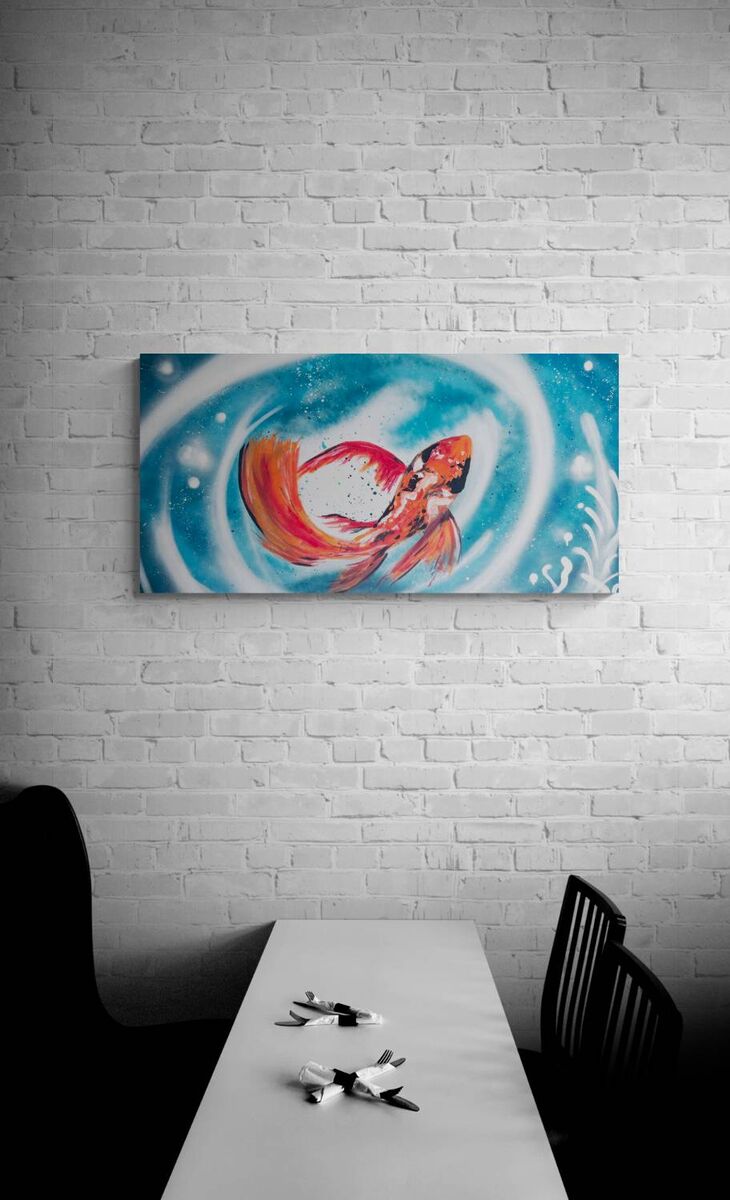Spray paint and Acrylic Mixed Media Art. This is my second time painting this Koi, hence the "too" factor. No. 1 was called "Don't Play Koi"